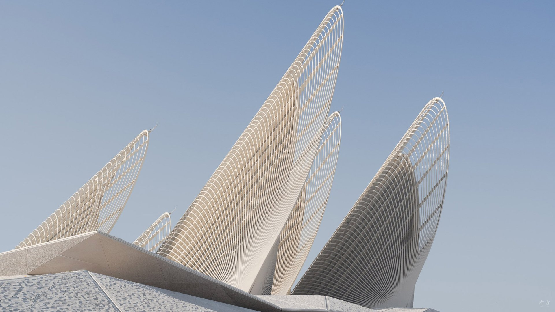 博物馆以阿联酋已故国父谢赫·扎耶德(Sheikh Zayed bin Sultan Al Nahyan)的名字命名,设计理念植根于阿联酋的文化基因与自然环境——猎隼作为阿联酋国鸟,象征着力量与自由。设计从这一文化象征中汲取灵感,将五片轻质钢塔塑造成猎鹰展翅的动感形态,实现美学表达与生态功能的统一,同时映射了谢赫·扎耶德的人生历程与治国理念。