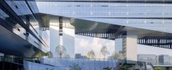 建东组团建筑是本次项目中新旧结合的代表。其中,建东大厦在外立面改造中采用了陶板—铝板复合幕墙系统与红色内墙涂料构成现代立面,丰富了街区的材质层次。