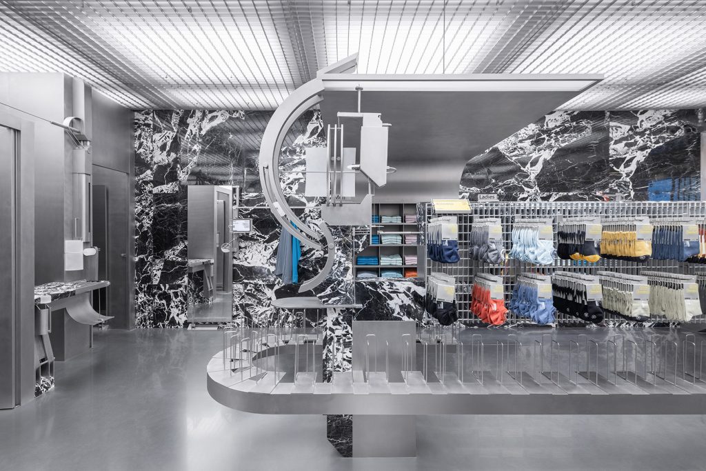 蕉内杭州概念店-杭州 2022年12月30日 作者:HY industries 蕉内杭州概念中心 - 杭州 今天要介绍的是由Some Thoughts工作室设计的,Bananain蕉内杭州概念店,设计师从坐标系中的几何元素获取灵感,垂直是重力最直白的表达,而压弯是对重力的一种诗意的刻画。店内大量的使用了斯维致平面型铝格栅,黑白大理石如同海浪般涌入由铝格栅所代替的网格矩阵中,随机与秩序的冲撞便以体验的形式出现。其金属的色调以及极具未来感的造型,将店面整体风格提升到了一个全新的高度。 当自然材料被破坏、打磨、重建,自然的残存帮助我们感知到有机的存在。在Bananain蕉内杭州概念店的设计中,Some Thoughts以大理石与金属材料进行碰撞的方式激活着“自然”,并使得有机物在结构和解构之间输出“过程的美学”。 上一篇厦门山海健康步道-厦门下一篇 林栖公园飞廊-成都
